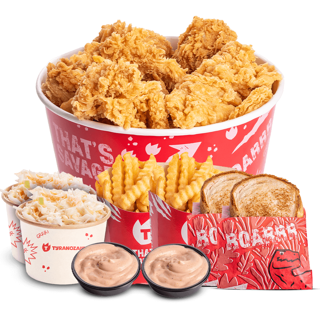 4 crispy strips, 6 aripioare, 4 copanele, 2 portii mari cartofi prăjiti, 2 coleslaw, 2 sosuri Tyranozaur, 2 Texas Toast